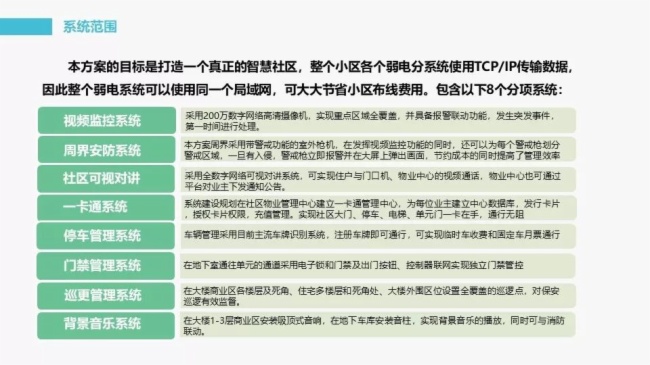 这个是厂房智能化弱电工程设计方案,这个涉及的系统就比较多了,非常具有参考价值。